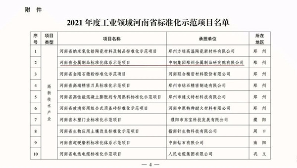 近日,中钢集团郑州金属制品研究院股份有限公司收到河南省市场监督管理局内部明电( 豫市监明电【2021】187号)《关于下达2021年度领域标准化示范项目的通知》,公司申报的“河南省金属制品标准化体系示范项目”荣获河南省2021年度工业领域标准化示范项目(位列高新技术产业第二名)。该项目的申报成功,为河南省金属制品标准化引领和金属制品产业质量提升起到模范带头作用,进一步推动了中钢集团郑州金属制品研究院股份有限公司的标准化工作的有序进行。